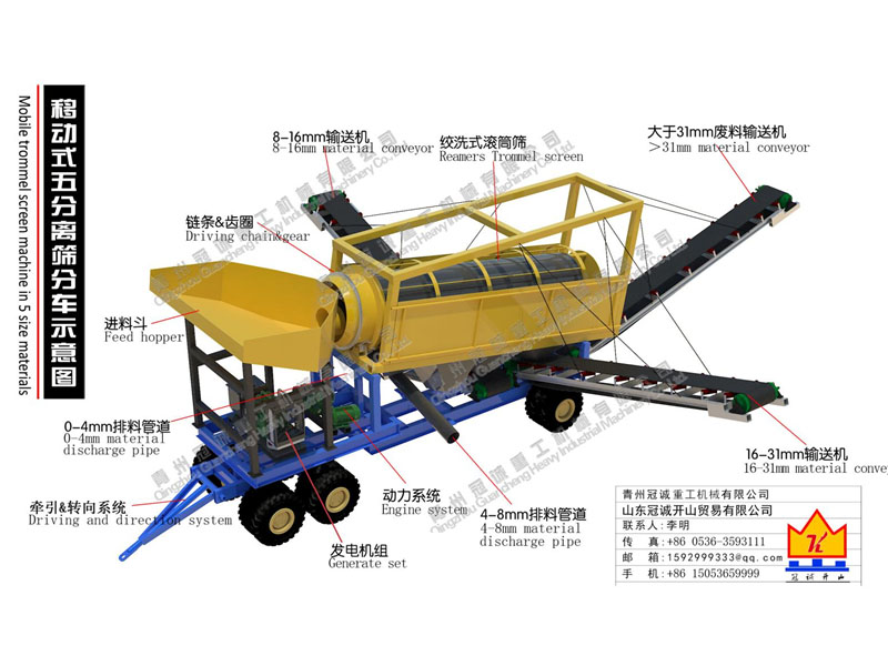 移動式五分離篩分設備,發(fā)電機組集成在底盤上,附帶牽引&轉向系統(tǒng),可以使用牽引車輛輕松移動至工作場地;其中篩分系統(tǒng)使用了新型核心技術的絞洗式滾筒篩,其優(yōu)勢如下: